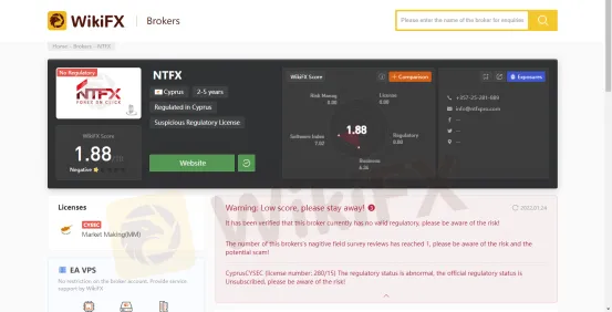 NTFX, also called NTFX Capital Ltd, was established in 2016. It is aregistered online Forex and CFD broker, However, it is verified that the brokers license issued by CySEC is canceled now.Therefore, NTFX is an unregulated broker. According to WikiFX, NTFX has been given by WikiFX a very low rating of 1.88/10. WikiFX verifies that this broker recently has no valid regulatory status. For your money safe, we suggest that it is your best option to stay away from this broker.