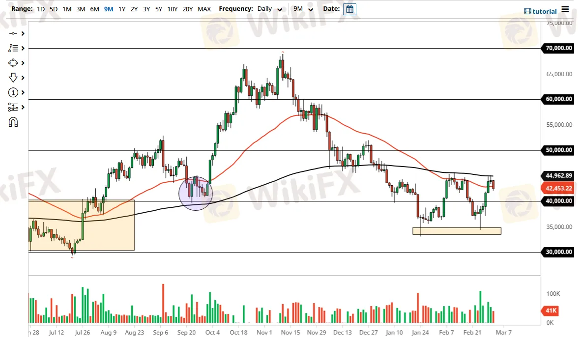 That being said, it is possible that we break out to the upside and if we do, a daily candlestick closing above the $46,000 level might open up the possibility of a move towards the $50,000 level. That is obviously an area that will attract a lot of headline noise, so I think that it might be a bit difficult to simply slice through. Nonetheless, this chart does not suggest confidence I think we have further to the downside before it is all said and done.