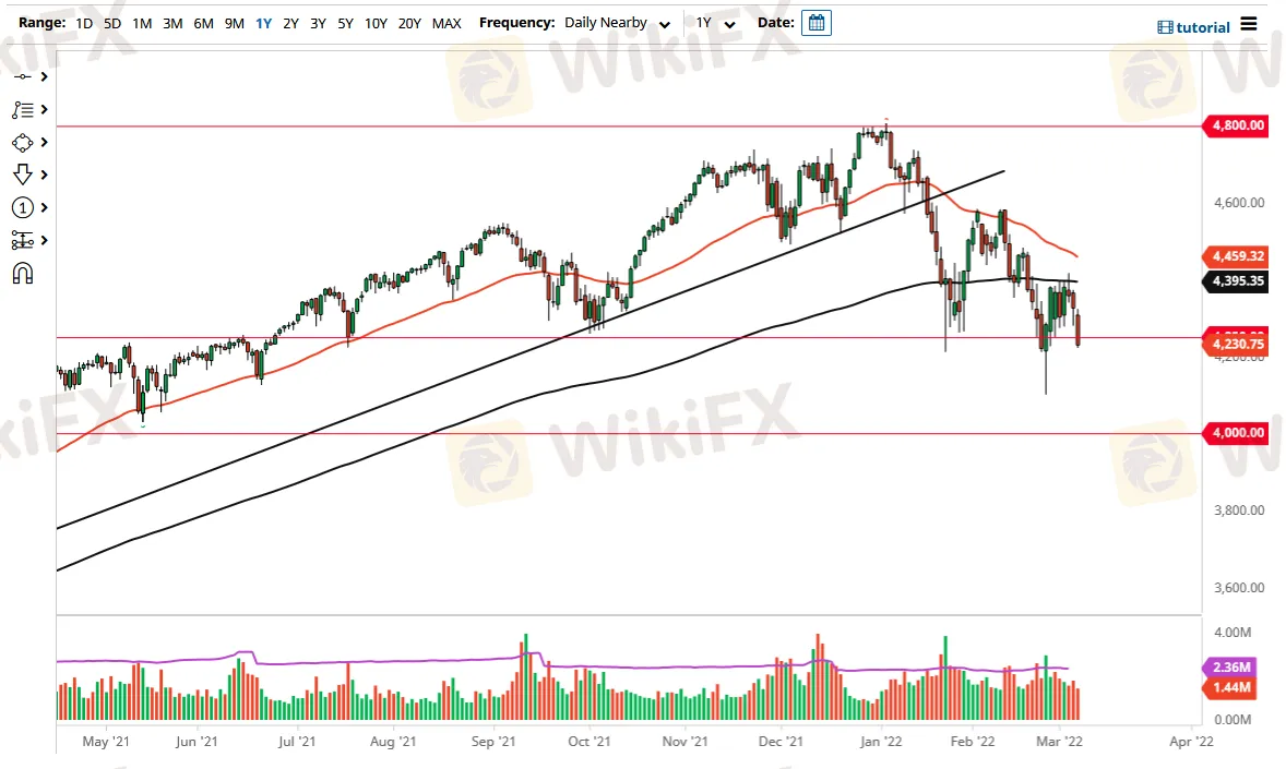 On the upside, the 4400 level features the 200-day EMA as well. Because of this, the market is likely to see a lot of selling pressure in that area, and I think it will be difficult to break above that area anytime soon. It is worth noting that the 50-day EMA is starting to crash towards the 200-day EMA, which would set up a “death cross” in the market which is a longer-term negative sign. This is a market that I think will continue to find plenty of reasons to go lower, not the least of which would be the war in Ukraine, but we also have to worry about inflation and a slowing rate of growth in the United States.