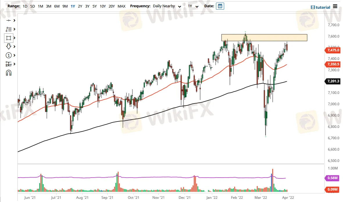 The size of the candlestick is worth noting as well because it does completely engulfed and swallowed the previous candlestick. That is of course a very negative sign, so breaking down from here would make quite a bit of sense. On the other hand, if we turn around a break above the highs of the trading session on Thursday, that could kick off an attempt to recapture the 7600 level. Breaking above the 7600 level could be a major turn of events, as it would allow this market to go much higher.