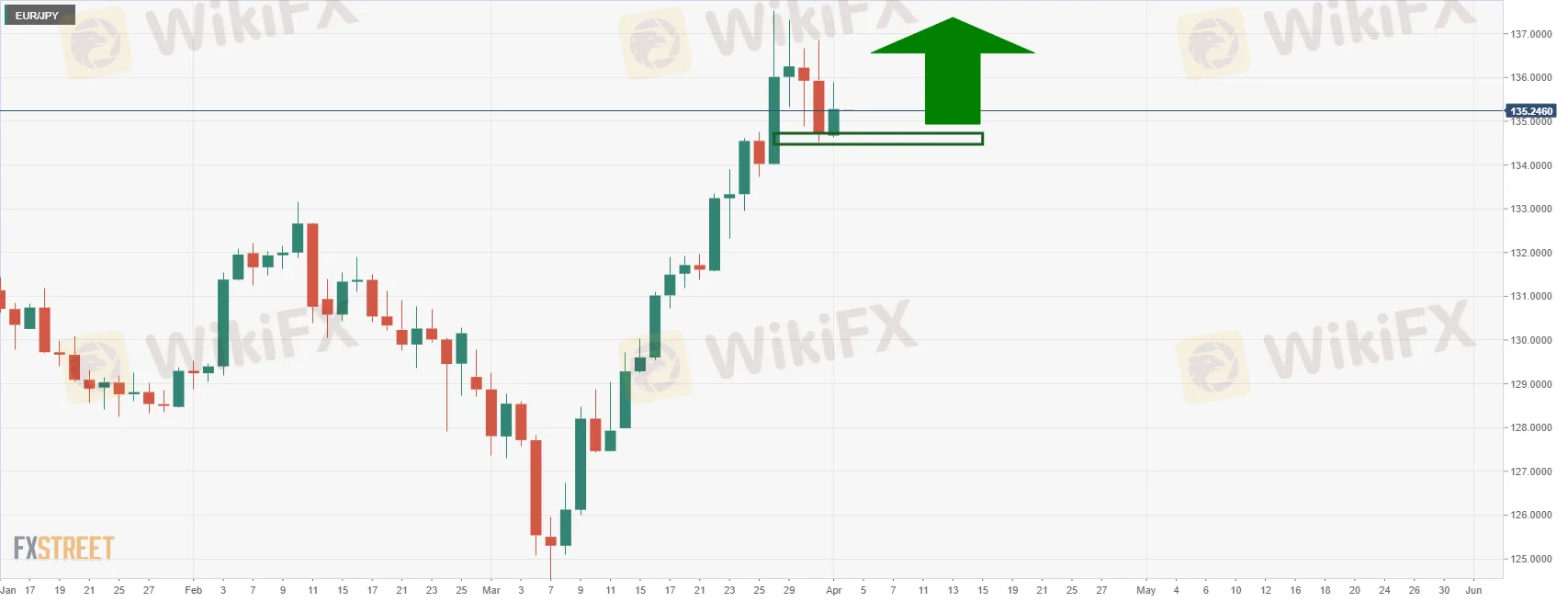 EUR/JPY leans bearish at the start of the week with a lack of impetus to move the needle so far. At 135.27, the price is a touch in the red, sliding from a high of 135.51 to a low of 135.10. The euro is under pressure as the US dollar firms due to central bank divergences.