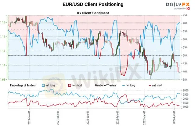 The IG Client Sentiment report shows 68.72% of traders are currently net-long EUR/USD, with the ratio of traders long to short standing at 2.20 to 1.