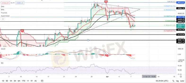 The first big stumbling block is located near the $43,830 mark. It is near the crucial drops 23.6 percent Fib retracement level from the swing high of $46,845 to the low of $42,905. The next resistance level may be near $44,275, where the price may struggle. If the price rises above $44,275, it may test the $44,875 barrier. It is close to the 50% Fib retracement level of the crucial drop from the $46,845 swing high to the $42,905 low.