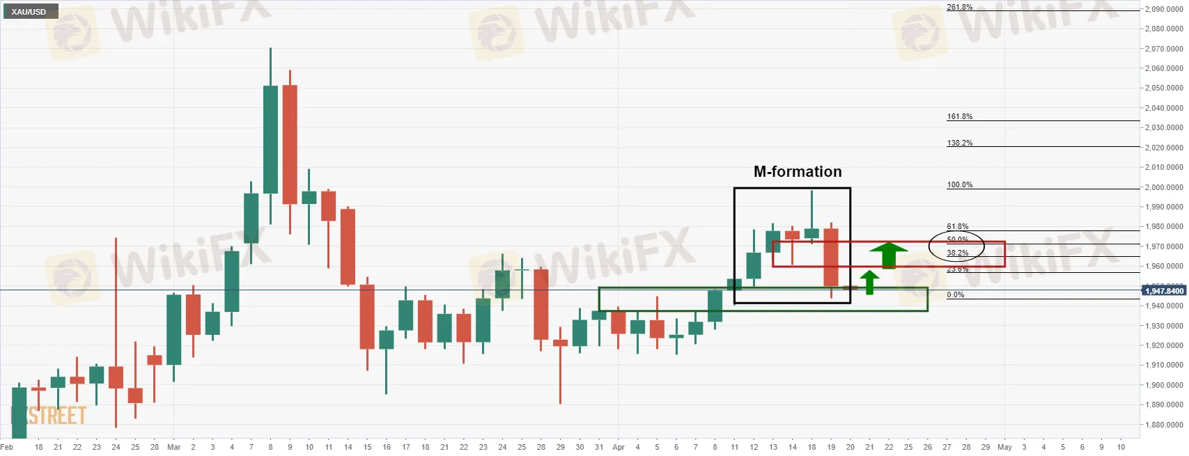 This is a reversion pattern whereby the price would be expected to be drawn back into testing the old support. This is otherwise known as the neckline of the pattern. The bulls would be meeting a 38.2% and 50% ratio block between $1,960 and $1,970. If, on the other hand, the price simply continues lower, then $1,915 comes as an important level at that point as the April 6 lows.