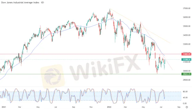 Therefore, our expectations suggest a return to the index's decline during its upcoming trading, as long as the resistance level 31,885 remains intact, to target again the important support level 29,653.30.