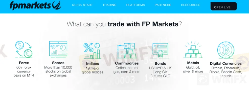 FP Markets advertises that it offers access to more than 1,000 instruments, including forex (60+ forex currency pairs) and CFD trading in shares, indices, commodities, bonds, metals (gold, oil, silver, etc.) and digital currencies of Bitcoin, Ethereum, Ripple, Bitcoin Cash and Litecoin.