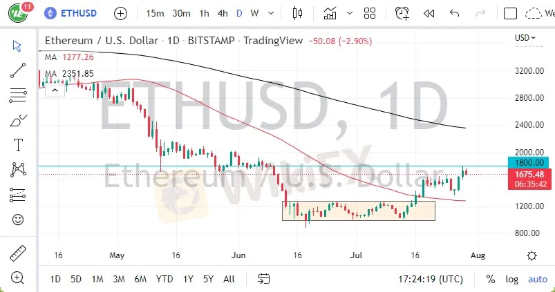 There should be a significant amount of noise between $1800 and $2000, so I think it‘s very likely that we will continue to see a lot of pushback in this general vicinity. In fact, it’s not until we break above the $2000 level that you can suggest that this market is going to take off for a bigger move. Granted, there are a lot of moving pieces at the moment, and its worth noting that the biggest type as of late is “The Merge” coming in September. That being said, Ethereum has a long history of disappointing when it comes to upgrades.