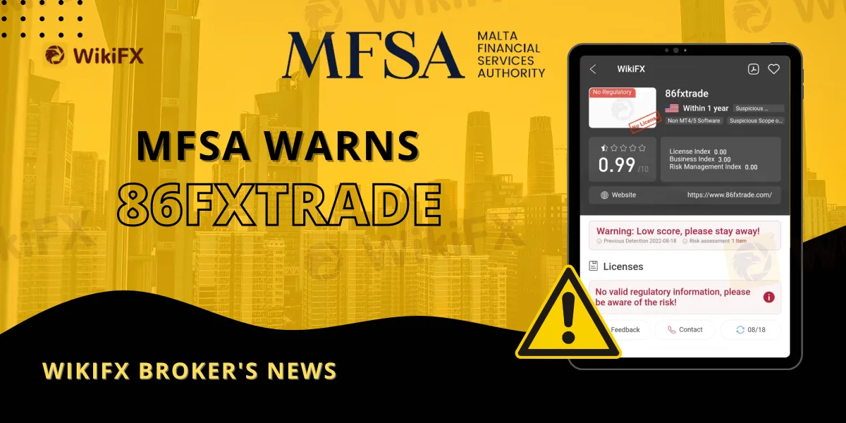 On August 8, 2022, the MFSA issued a public notice informing the public that 86FXTRADE is not a Maltese registered business nor licensed or otherwise allowed by the MFSA to offer investment or other financial services.