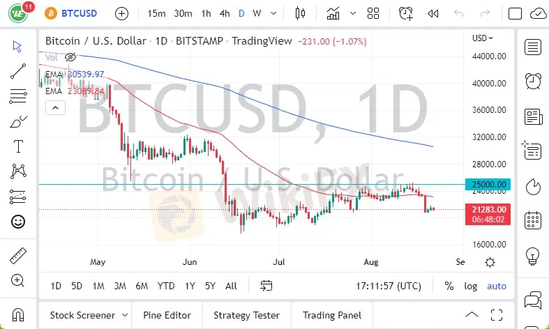 Rallies at this point will more likely than not end up being looked at with suspicion, with the 50 Day EMA sitting just below the $24,000 level offering a bit of resistance. Beyond that, we have the $25,000 level, which has recently offered quite a bit of selling pressure. Because of this, I think you need to keep looking at this market through the prism of one that is in a downtrend, and that has not changed. In fact, its very likely that we will continue to see a lot of negative pressure, and a breakdown below the $20,000 level could kick off a bigger move to the downside. If that happens, we could see Bitcoin unwind all the way down to the $12,000 level over the longer term. It is worth noting that the $12,000 level with where the entire bullish run had kicked off from.