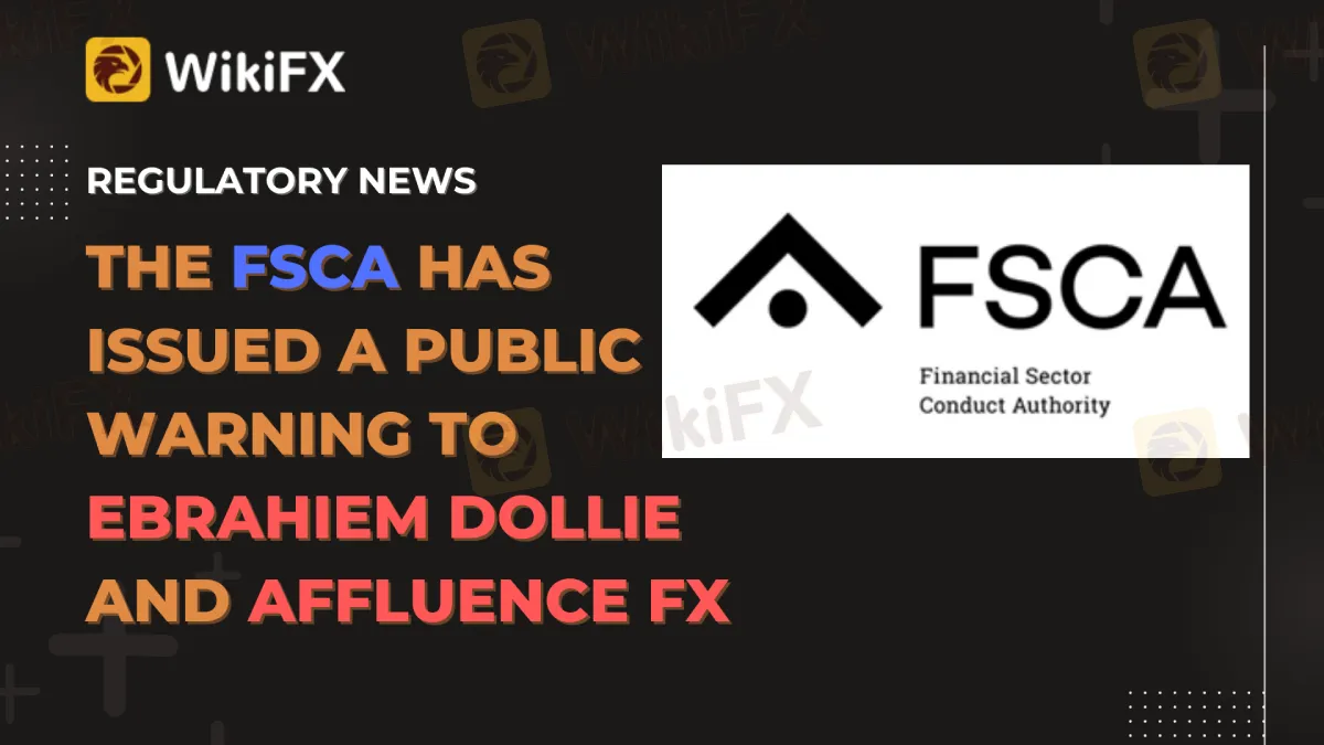 Abstract:The Financial Sector Conduct Authority (FSCA) advises the public to exercise extreme care when dealing with Ebrahiem Dollie and Affluence FX. Ebrahiem Dollie and Affluence FX are suspected by the FSCA of engaging in unlawful financial services activity and violating several financial sector laws.