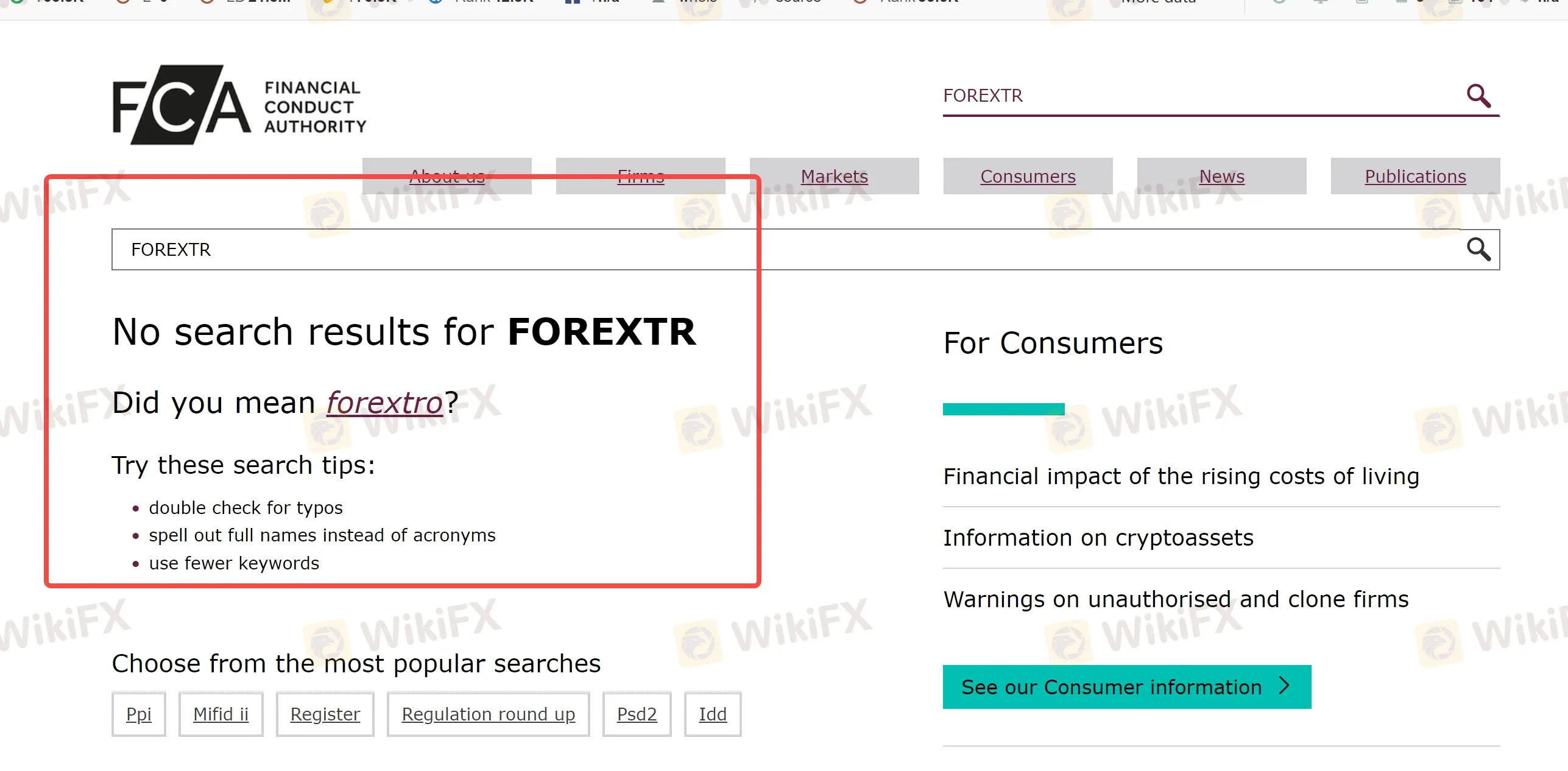 As you can see from the screenshot that the search page shows“ no search results for ForexTR”, which makes it clear that the company is not regulated by the FCA.