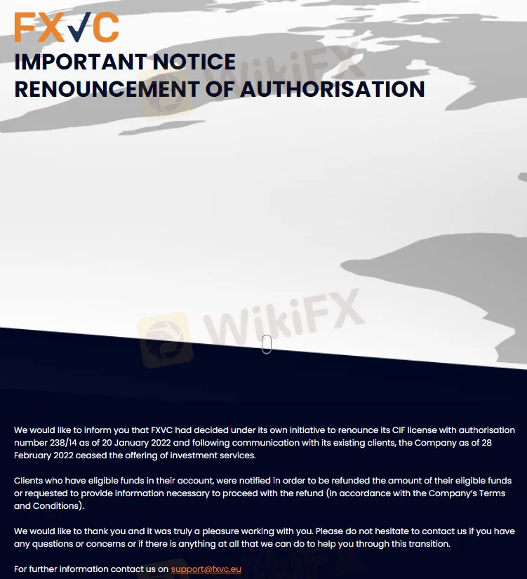 FXVC(https://www.fxvc.com/eu/) announced that it has applied to abandon its CIF license of CySEC with authorisation number 238/14 as of 20 January 2022 and ceased the offering of investment services to its clients as of 28 February 2022.