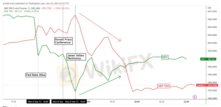 She noted that the government is not looking at offering “blanket” deposit insurance to stabilize the banking sector. This amplified selling pressure in regional banks, with First Republic Bank down over 15% by the end of the day. In the chart below, you can get a better idea of how price action evolved throughout these events and how the S&P 500 reversed and the US Dollar bottomed.