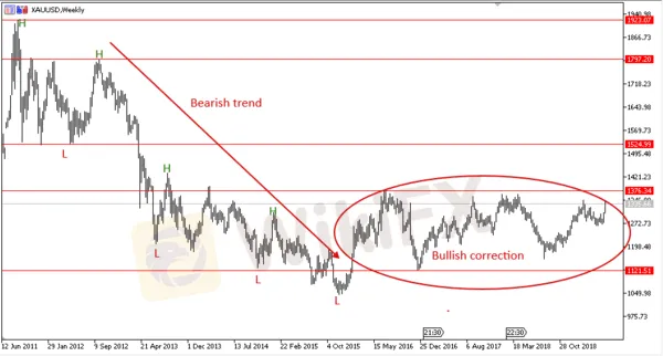The XAUUSD Weekly chart shows clearly that the prevailing trend from 2011 is bearish. Bearish trends are made of lower lows and lower highs. However, a bullish correction has started on the weekly chart, as the last high (H) on the bearish trend was broken upside. The bullish correction could continue. Therefore, you would like to reassess your entry/exit points and adopt your trading strategy to possibly a bullish trend.