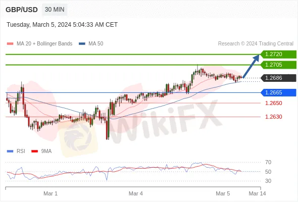 GBP/USD: Intraday bullish. Look for long positions above 1.2665. Targets: 1.2705, 1.2720.