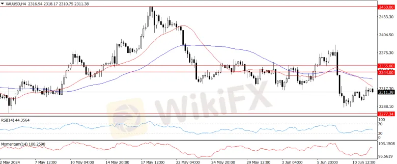 Gold prices have continued to fall after breaking below an upward wedge pattern. If they decisively drop below the May 3 low of $2277, there is a high chance they will fall further. The next support level for gold is at the psychological level of $2250. The 14-day RSI is below 50, currently around 44, indicating that gold prices may continue to decline. Any recovery in gold prices would need to break above the 50-day moving average at $2344. After that, reclaiming the 21-day moving average at $2355 would be crucial to remove the recent bearish trend.