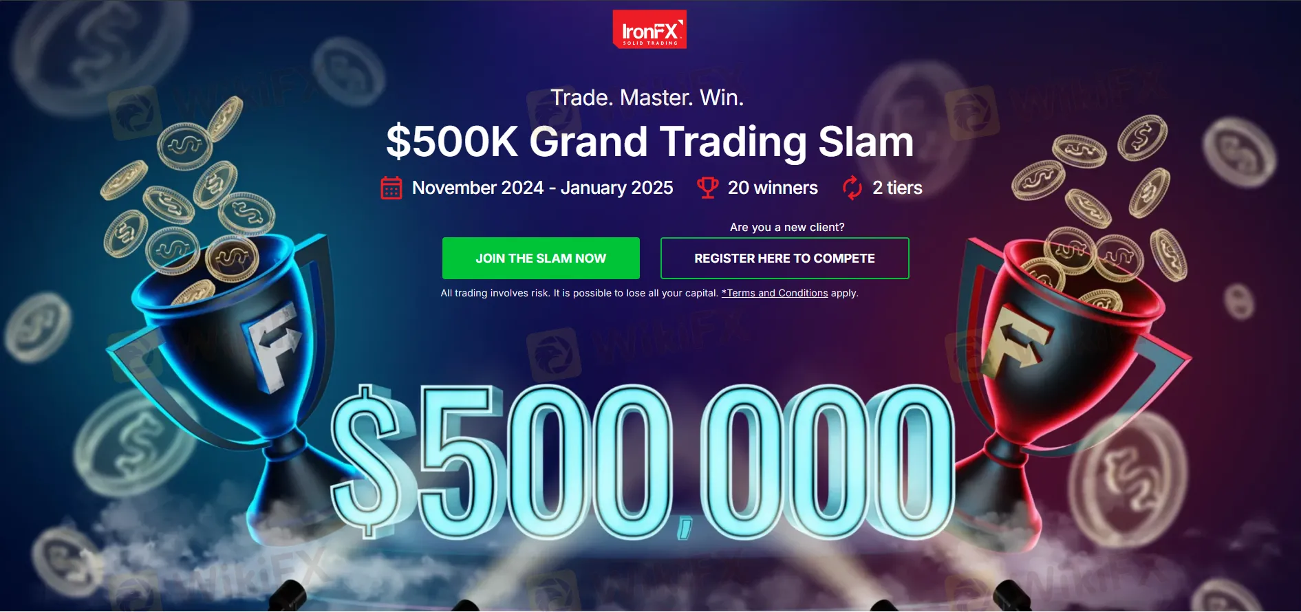 IronFX, a leader in global online trading, has announced its latest competition, the $500K Grand Trading Slam, set to run from November 2024 through January 2025. This thrilling event is a golden opportunity for traders worldwide to demonstrate their skills and compete for a share of the half-million-dollar prize pool. Divided into two tiers—Elite and Master—the competition accommodates traders at different levels, offering substantial rewards for the top performers\