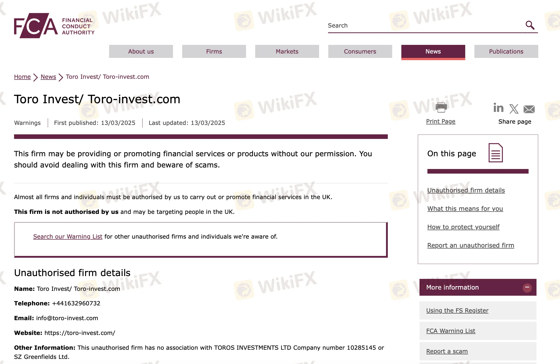 Other Information: This unauthorised firm has no association with TOROS INVESTMENTS LTD Company number 10285145 or SZ Greenfields Ltd.