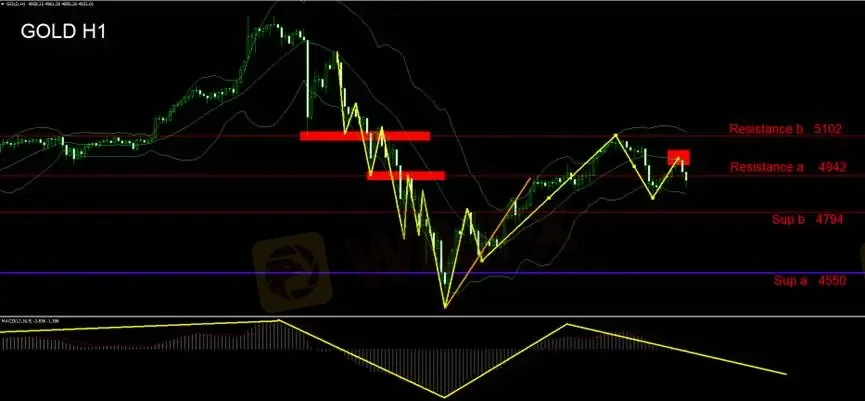 Using Bollinger Bands on the hourly chart, golds band expansion has shifted from upward to downward. Price action previously rallied toward the horizontal resistance level at 5102 before reversing lower. A subsequent rebound toward the middle band was followed by a bearish close, triggering a short-selling signal.