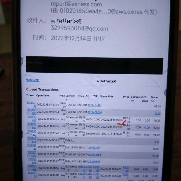 2022年12月13日晚上九点三十分,cpl公布前,我持有黄金0.27手。当小时30分钟消息公布后不到1秒钟,国际黄金向上爆发20美金,由1790上涨至1812附近。接下来行情一直处于1810附近盘整,我的订单是9点30分05秒成功平仓的。结果EXness恶意卡盘,把我的价格停留在1790.47的最低位置。足足让我损失540美金。事后申诉,他们简单一句服务器出现故障,忽悠一下。之后不再理会。 国际大品牌,竟然如此欺诈投资者。尤其是中国大陆投资者。以上截图,全部是本人真实账户。