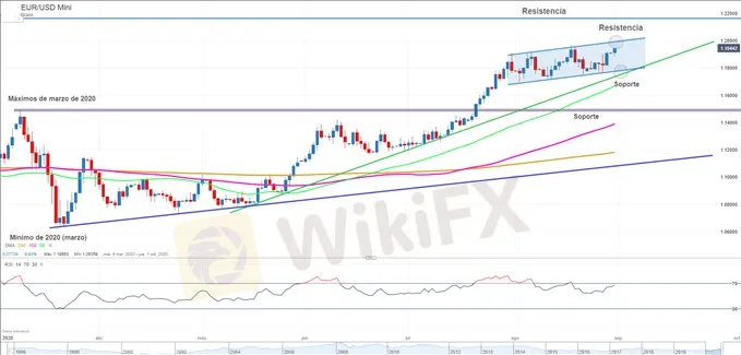 ANÁLISIS TÉCNICO DEL EUR/USDSi el EUR/USD continúa avanzando, la primera resistencia para tener en cuenta se ubica en la zona de los 1.1965/1.2000. Aquí el máximo de 2020 se alinea con el límite superior de un canal ascendente de cuatro semanas. Si los vendedores toman control del mercado desde esos niveles, es necesario estar preparado para una corrección capaz de llevar al precio hasta el soporte en los 1.1775/1.1750. Una ruptura de este piso pondría en juego la región de los 1.1500.