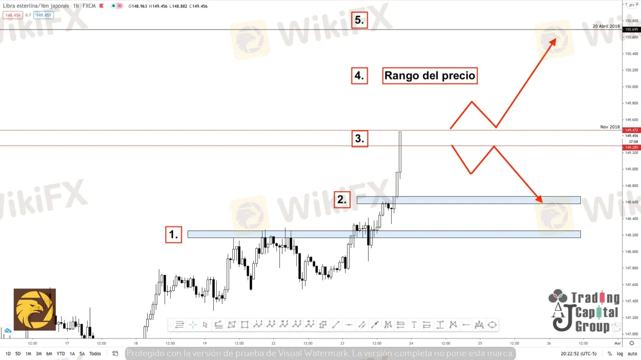 3. Zona de resistencia que permitirá al precio consolidar una zona de oferta para poder hacer compras y aprovechar el rango del precio (4) para obtener los mejores beneficios posibles. De consolidarse como zona de soporte, habría que estar atentos al movimiento del precio para que se mantenga dentro del rango optimo, de lo contrario estaríamos buscando ventas por debajo de dicha zona.