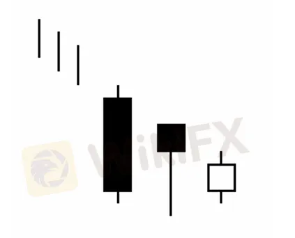 El mercado está en pleno tramo bajista con lo que el primer día de la pauta se forma una vela larga negra. Al tropezar con un probable soporte o bien un mercado sobrevendido las fuerzas alcistas ven su oportunidad de contraatacar abriendo el segundo día en un nivel bastante más alto que el cierre del día anterior, si bien las fuerzas bajistas aún tienen el control debido a la inercia del mercado bajista y prosiguen las caídas formando ese día nuevos mínimos que probablemente han perforado el soporte. En este punto y viendo que la fiabilidad del soporte es fuerte, vuelven las compras cerrando cerca de la apertura formando un martillo con una sombra larga que ha dejado otro soporte en toda la longitud de su sombra. Las fuerzas bajistas cada vez están menos seguras de sus posibilidades y en el tercer día se forma una peonza (spining top) de cuerpo blanco donde se ve ya un equilibrio entre ambas fuerzas e incluso una ligera ventaja de las fuerzas alcitas debido al cuerpo blanco de la peonza