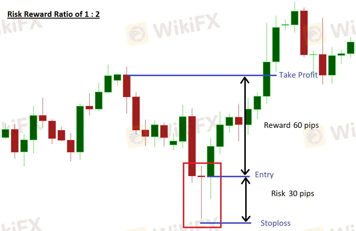 Si tienes un capital de US$1.000, y tu porcentaje de riesgo por operación es del 2%, arriesgarás US$20 en tu próxima operación. Por lo tanto, si tiene una relación riesgo/recompensa del 2:1, cuando pierda, perderá US$20, pero cuando gane, ganará US$40. Vea el primer gráfico a continuación, donde el riesgo es de 30 pips y la recompensa es de 60 pips con un ejemplo ilustrado.