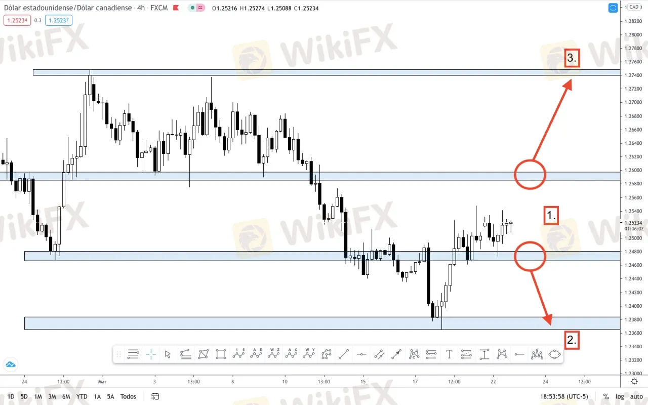 2. Zona inicial del rally alcista. Como zona de demanda, en caso de una pérdida de volumen del precio, este nivel podría consolidarse como un espacio de ganancia, para ventas por debajo de los 1.24700