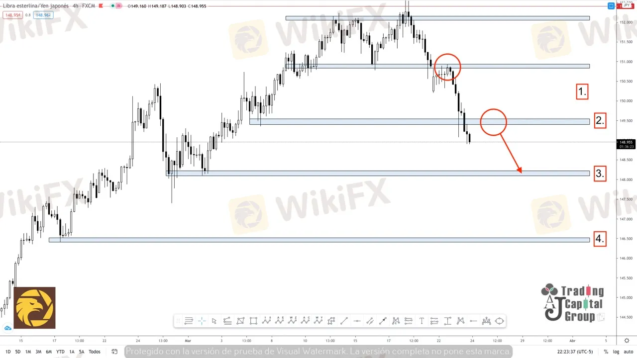3. Como zona intermedia de participación bajista, el nivel de los 148.300, podría ser un punto parcial de llegada del precio en cuanto a un movimiento de contra tendencia en el que se podría encontrar posibilidades de compra.