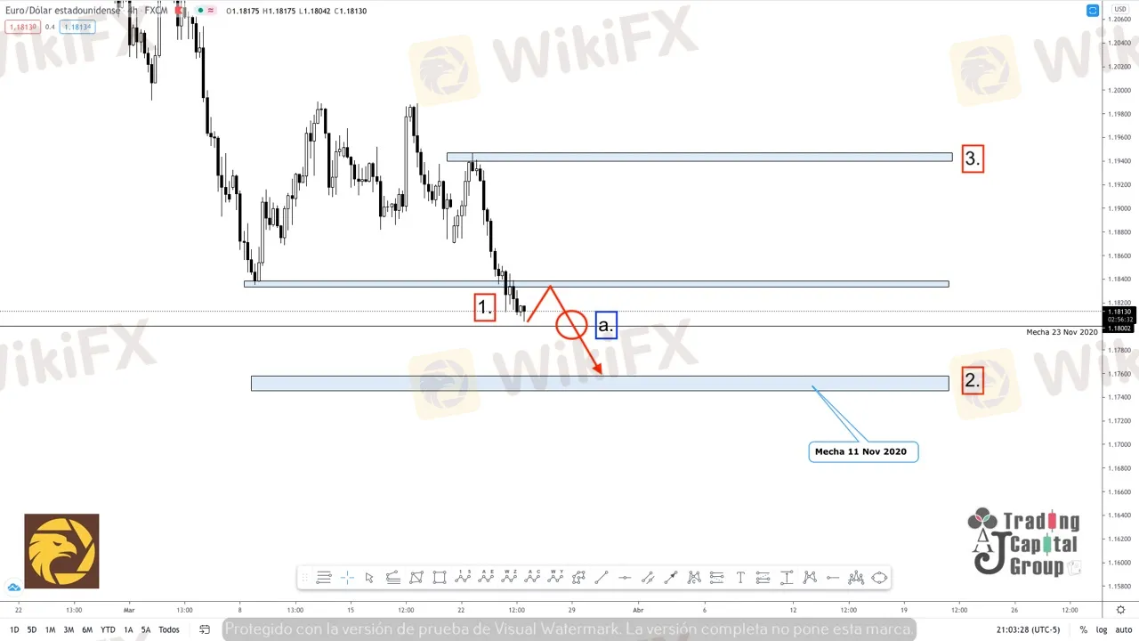 a. De buscar entradas en venta, se esperaría una ruptura y posterior retesteo de la zona de mecha del 23 de noviembre, hasta llegar al nivel de la mecha del 11 del mismo mes.