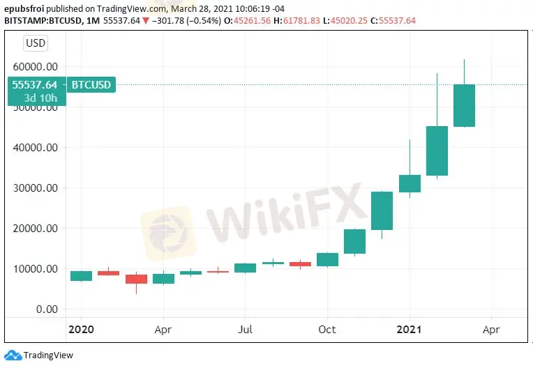 Como se aprecia en el gráfico de velas mensuales anterior, la caída de precio hace un año se ve minúscula en el presente ciclo alcista, y el precio de BTC ha aumentado casi 600% en los últimos 12 meses. Los últimos dos trimestres han sido particularmente auspiciosos para la primera criptomoneda, especialmente el cuarto trimestre de 2020, con 176% de apreciación.