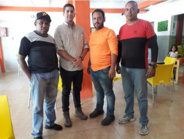 Los periodistas Luis Gonzalo Pérez y Rafael Hernández (centro) junto a dos activistas de la ONG FundaRedes, detenidos por autoridades venezolanas en Apure, Venezuela.