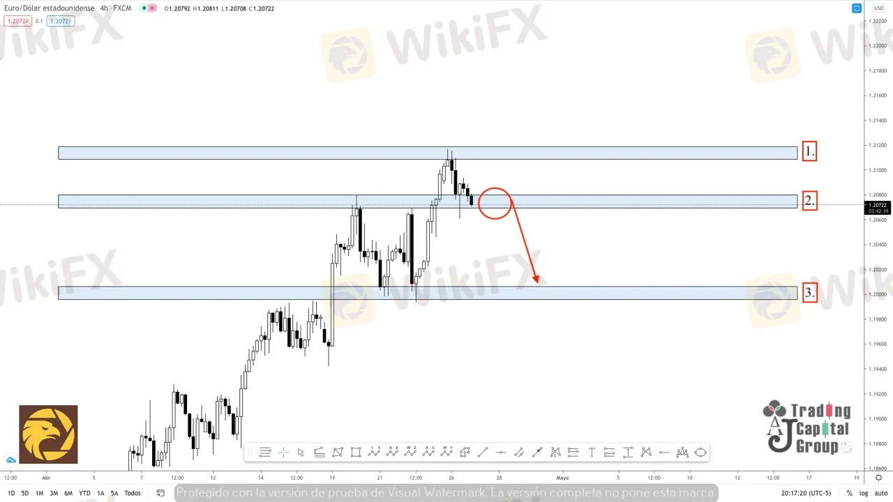 1. El precio acaba de crear un nivel de rechazo importante sobre los 1.21100 que en temporalidades inferiores, se determina como una zona de distribución. Así pues se presenta un escenario de venta importante para este par, siempre y cuando el precio conserve un impulso de venta por debajo de los 1.20700 (2)