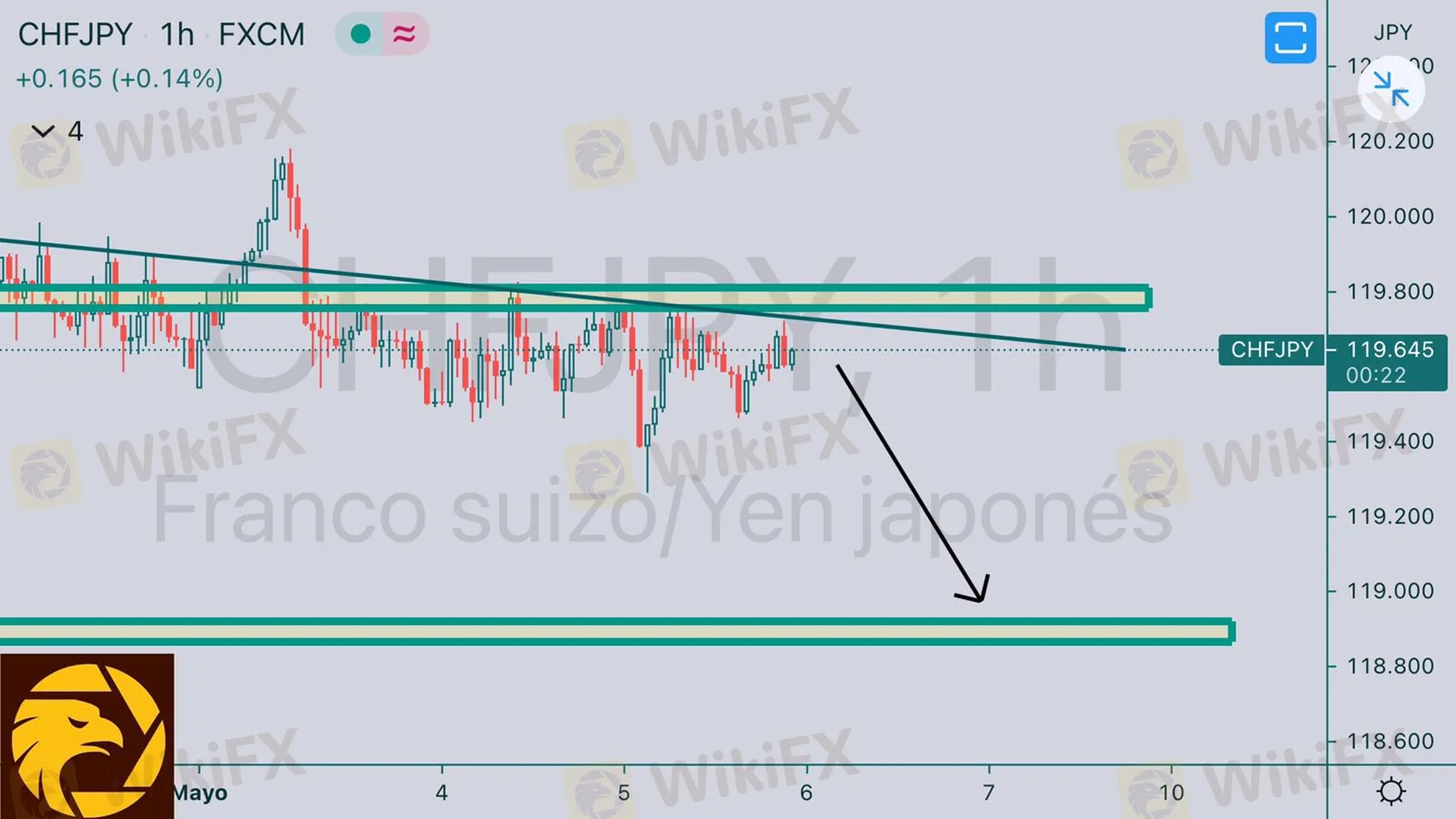 en zona de resistencia fuerte, el precio lleva 2 semana en esa zona y vemos un canal de tendencia bajista en esa zona de acumulación del precio, podemos buscar ventas a partir del precio 119.604 para obtener beneficios cortos.