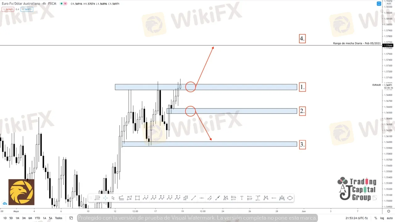 4. Por el contrario, de consolidar un volumen de compra, el precio podría crear un escenario alcista por encima de la zona (1) llegando hasta cubrir la zona de la mecha del 5 de feb de 2021. Teniendo en cuenta que al precio podría estar buscando una continuación del movimiento general.