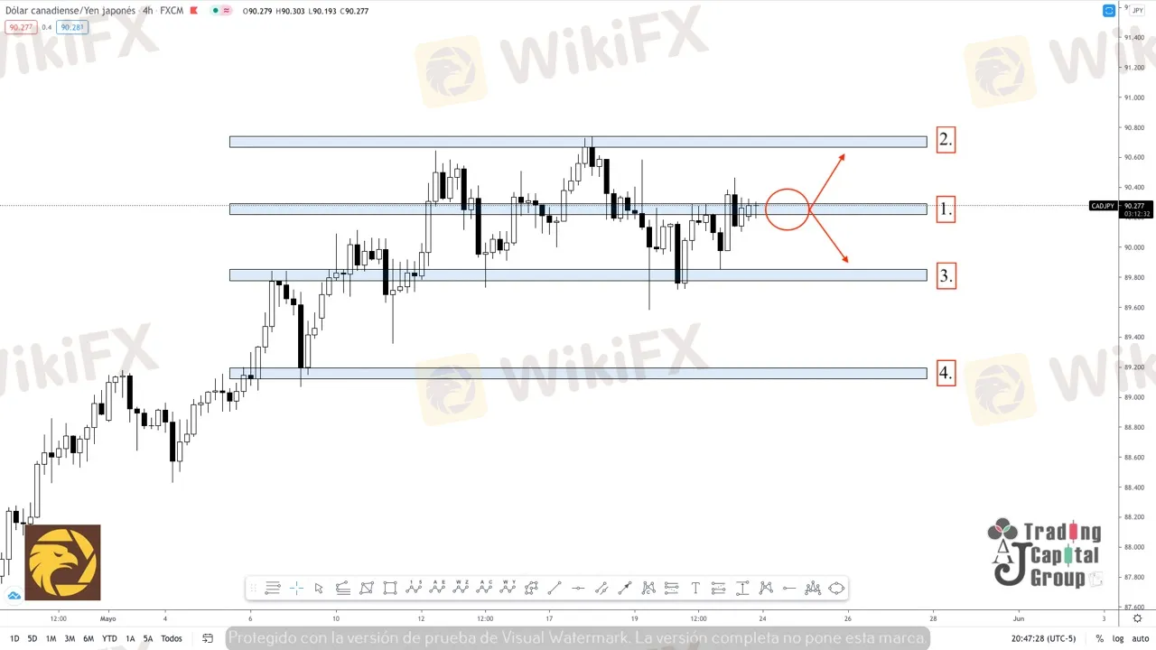 3. De salir de la zona (1) con la fuerza suficiente, el rally de venta continuaría hasta esta zona, permitiendo continuar con un movimiento correctivo. Sin embargo debe dejar la zona (1) con suficiente volumen.