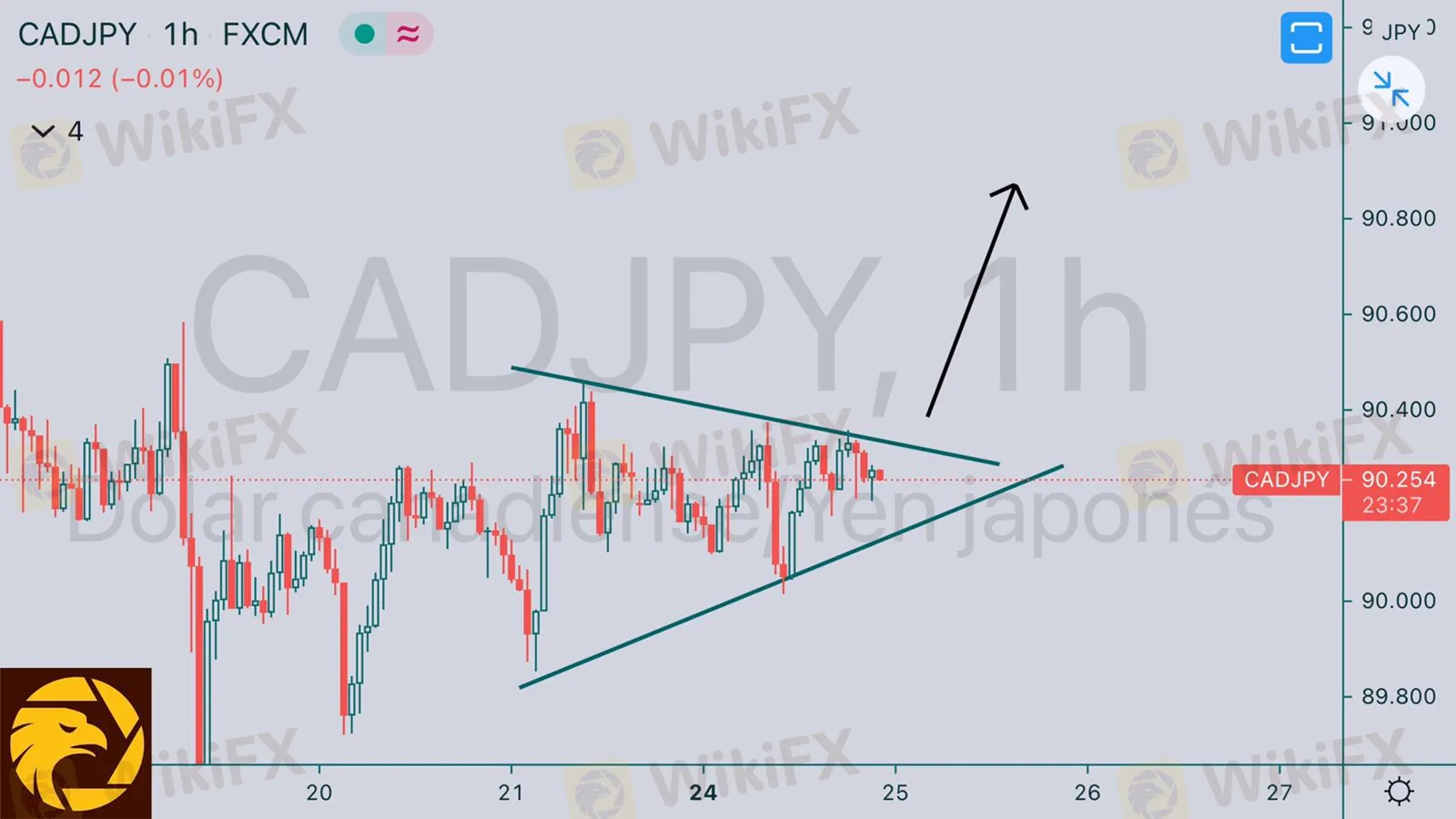 CADJPY el precio tiene macrotendencia alcista en su cotización y ha formado un banderín alcista así que tomaremos posiciones de compras a partir del precio 90.400