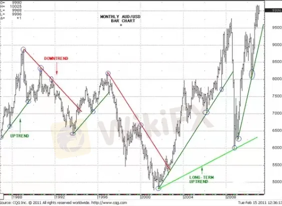 A modo de ejemplo, aquí está el gráfico mensual (1 barra para 1 mes) de AUD / USD. Aquí puede ver líneas de tendencia alcista (verde) y líneas de tendencia bajista (rojo)