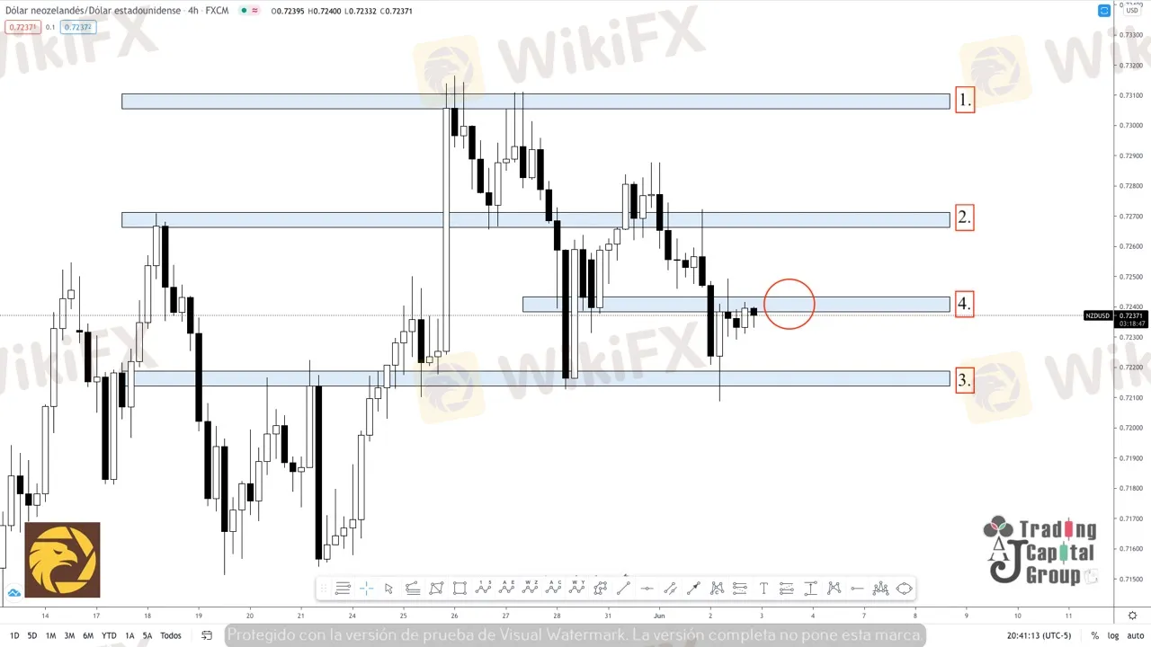 4. Este nivel se convierte e un punto de reacción del precio para crear un patrón de venta o de compra, dependiendo del cómo reaccionen las velas por encima o por debajo de este. Antes de tomar posiciones es necesario hacer un seguimiento de las zonas (3) y (4) para establecer seguridad en cuanto a la dirección de este activo.