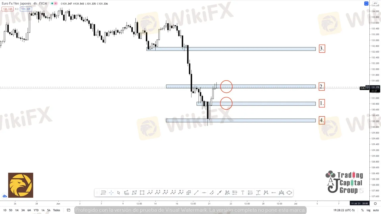 3. Sin embargo, de conservar la estructura de compra del precio y consolidar un patrón de compra durante los próximos días. El precio podría, culminar su trayecto en este nivel, dado a que no hay un trafico importante de velas que impida al precio llegar hasta la zona de los 131.378 (3).