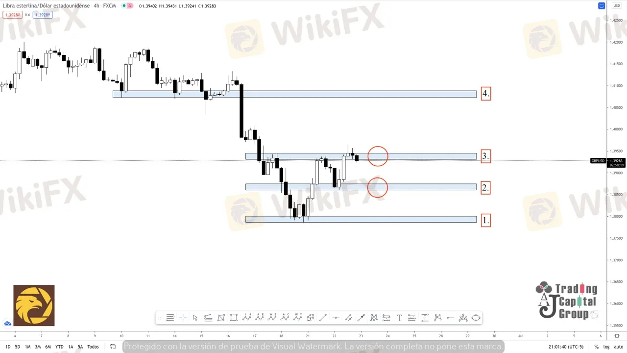3. Ultima zona de distribución intermedia del precio que permitió crear la zona de participación alcista del precio. De cerrar por encima de este nivel, podría establecer un punto de entrada para conservar su momentum alcista y llevar un rango de ganancia hasta los 1.41000 (4).