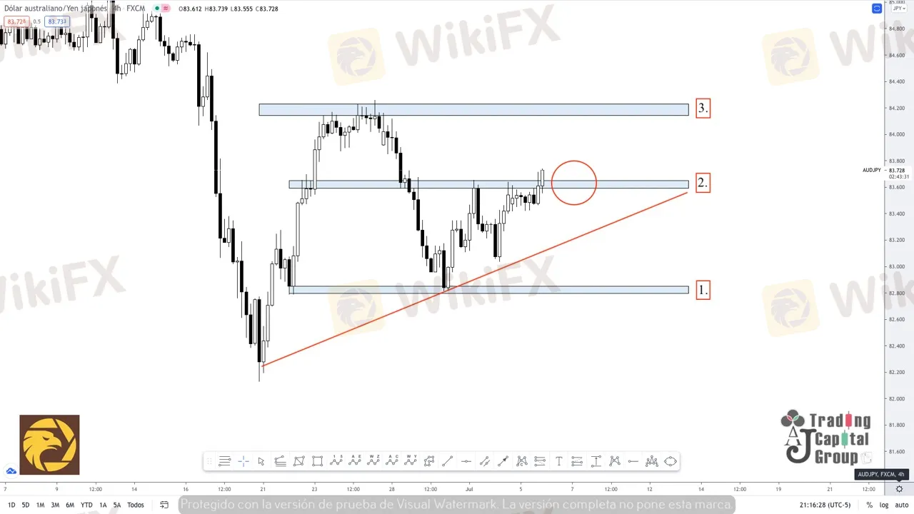 3. Nivel de llegada del precio en un movimiento de venta, que podría consolidarse, por debajo de la zona (2) y podría volver a tocar la linea de tendencia consolidando una tendencia alcista.