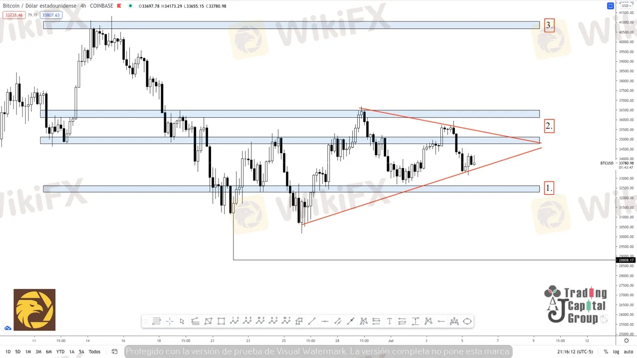 3. Debido a que el precio ha frenado su caída dentro del rango de los $33.500 se ha creado una estructura de banderilla para consolidar un posible impulso alcista. De ser así, el precio podría llegar a este rango de precio para crear un cambio de tendencia o por lo menos de impulso alcista.