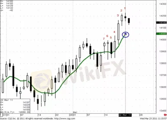 En este caso, nuestra barra # 1 no participará en el cálculo, porque ayer no se ha cerrado. Y debemos tener en cuenta la barra que se encuentra antes del # 7 en el gráfico # 1. Entonces, debería verse así: