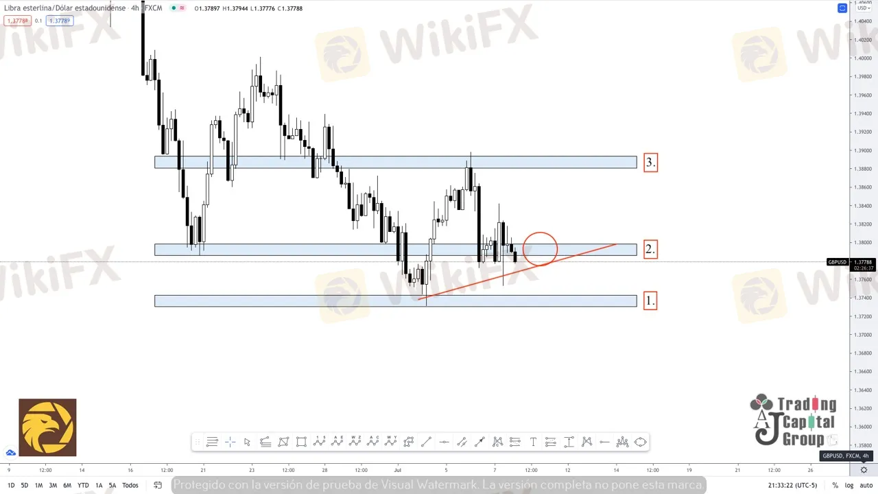 2. Se determina como una zona de resistencia en la que el movimiento del precio puede lleva a crear una continuación del impulso alcista hasta a la zona (3) de los 1.38800