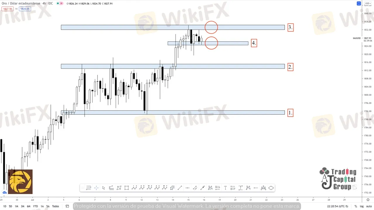 2. De continuar el movimiento alcista se buscaría pasar por encima de esta zona para buscar un nivel de resistencia delimitado sobre los 1824 (4) aproximadamente.