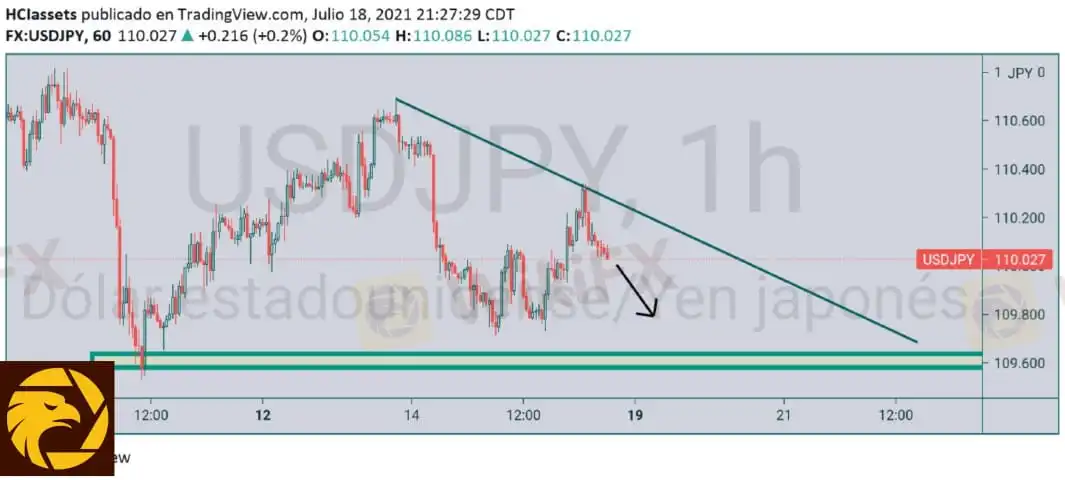 USDJPY el precio en tendencia bajista clara con fuertes sprints que nos ha dejado su patrón de bajada, tenemos una zona de soporte marcada allí en nuestro objetivo. Podemos buscar ventas a partir del precio 109.900