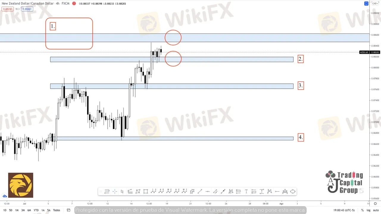 4. Se determina esta zona como un nivel de ganancia optima en la recuperación del precio, debido a que es un nivel de oferta fuerte creado en el gráfico diario, semanas atrás.