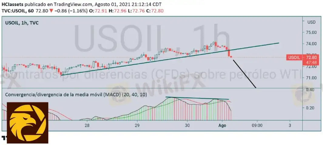 WTI petroleo en máximos nuevamente ante en conflicto en el golfo entre Israel, Irán y Omán vemos divergencia clara en la tendencia alcista y ruptura de la misma el precio baja así que podemos buscar ventas a partir del precio 72.00